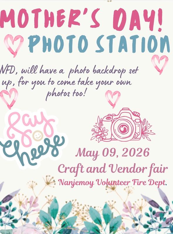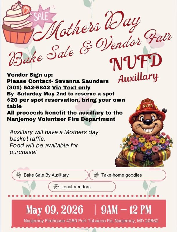 The Nanjemoy Volunteer Fire Department Auxiliary is hosting a Mother’s Day Bake Sale & Vendor Fair on May 9th, 9am - 12pm. See flyers for more information.